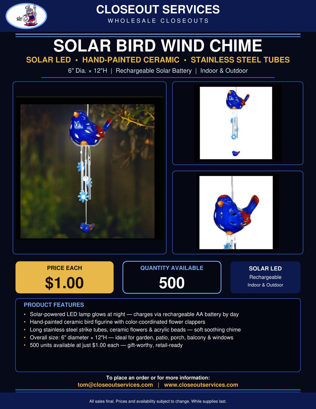 - Hand-painted ceramic bird with flower clappers