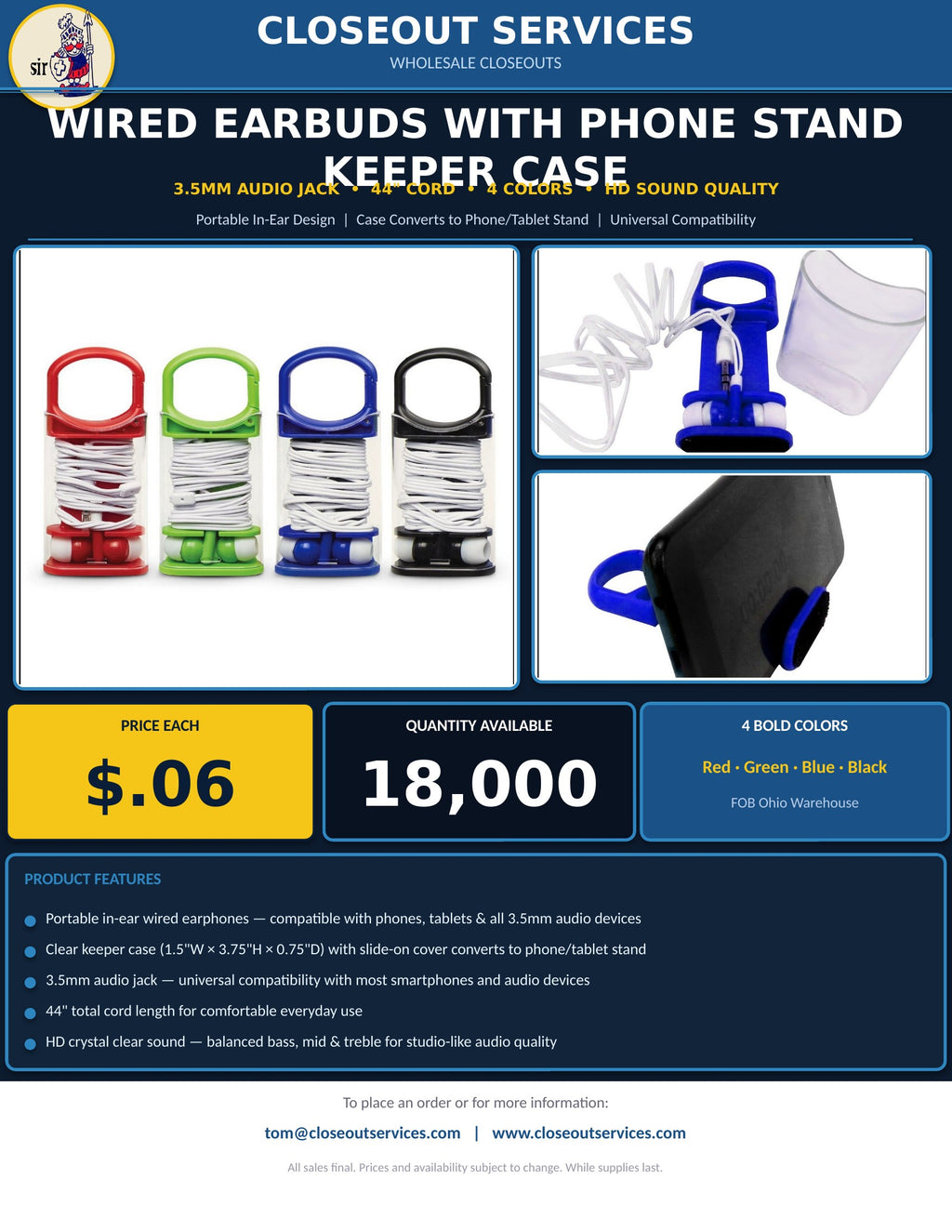 - Portable in-ear earphones — 3.5mm jack, 44" cord — 4 colors: Red, Green, Blue & Black