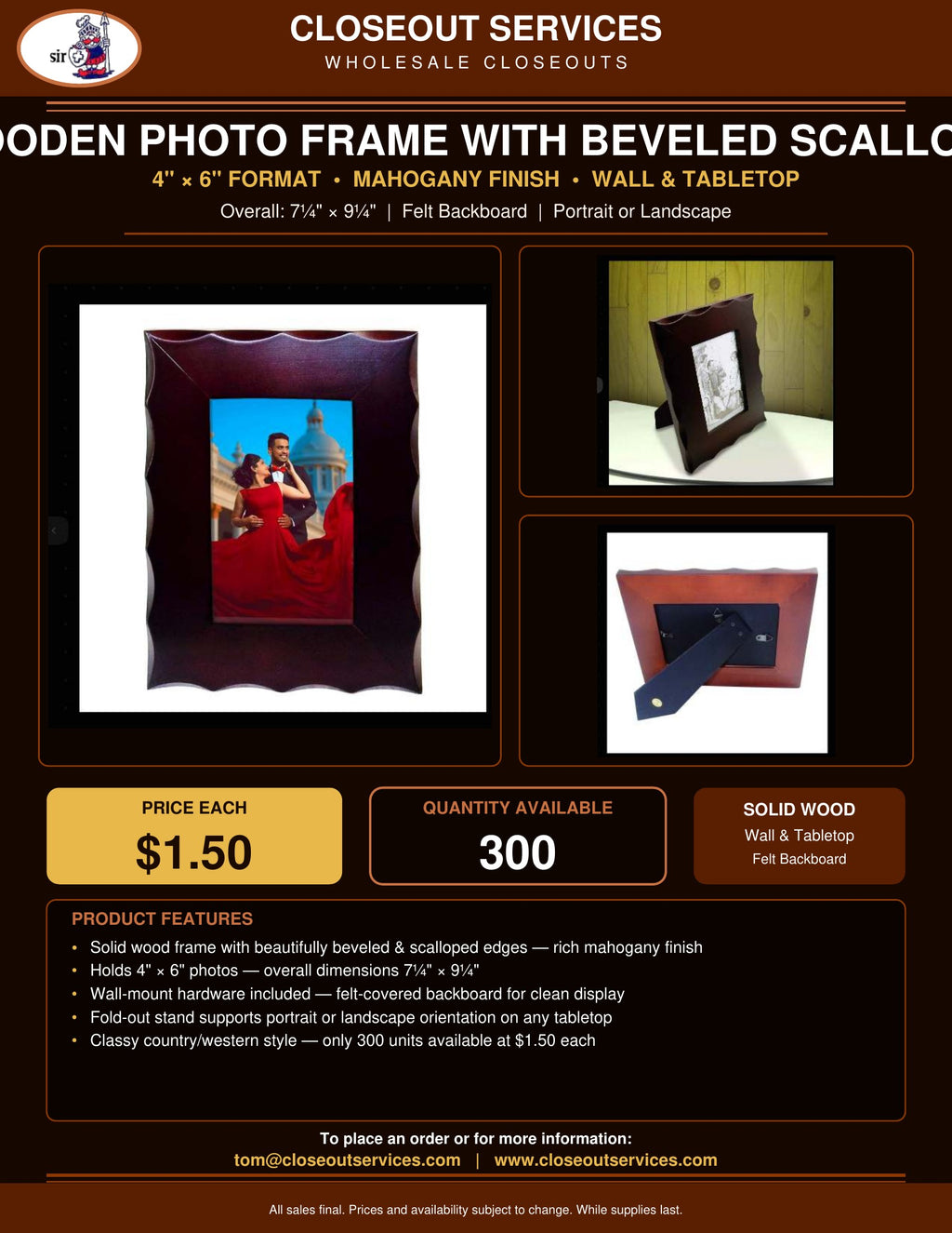 - Solid wood mahogany finish — scalloped edges